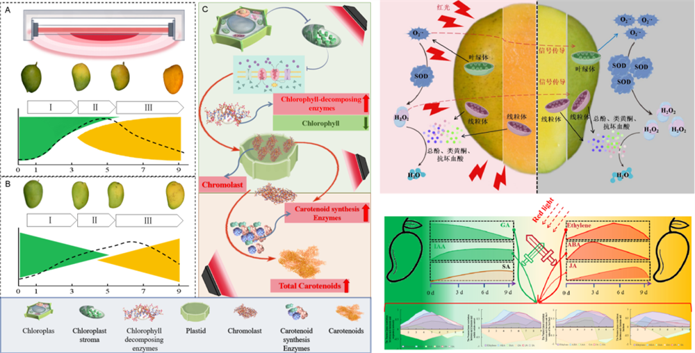 圖1 紅光對芒果類胡蘿卜素合成、活性氧產生清除、激素累積的影響以及紅光誘導芒果成熟機制圖