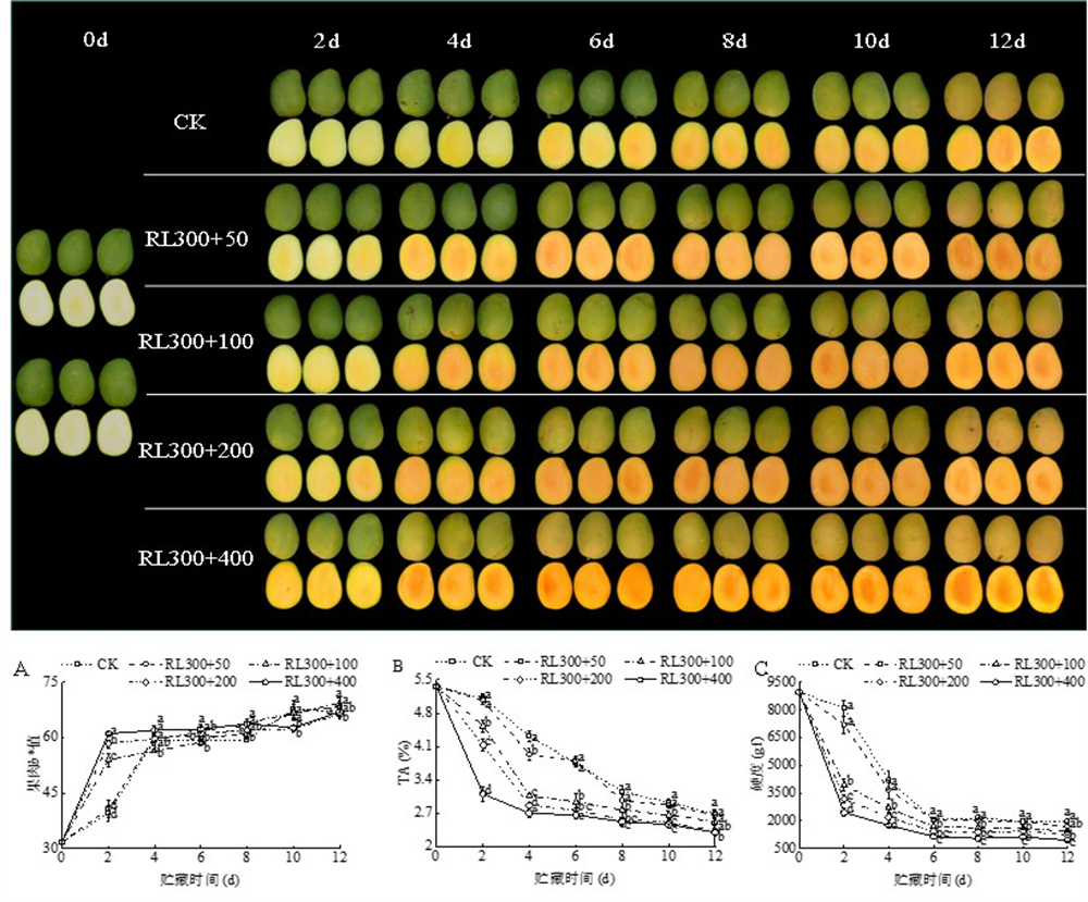 圖2  紅光減量乙烯利催熟處理對采后芒果果皮果肉形態變化的影響以及紅光減量乙烯利催熟處理對芒果果肉b*值(圖A)、可滴定酸(圖B)、硬度(圖C)的影響