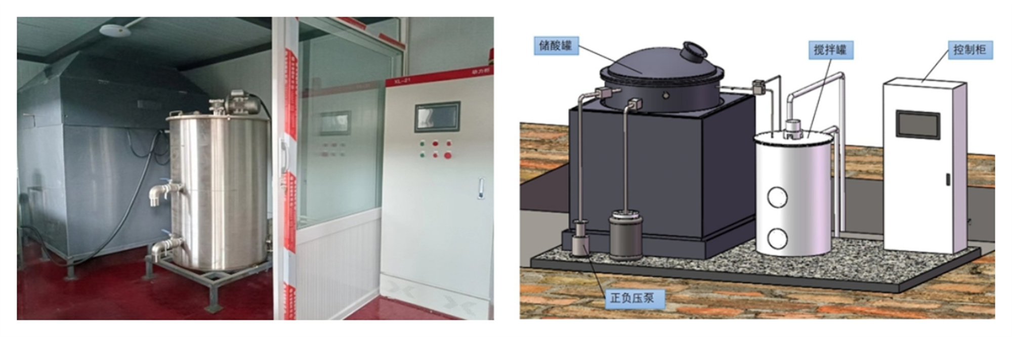 1. 開發了液體糞污酸化貯存發酵技術裝備,解決了糞水酸化貯存工藝自動化控制難題。優選了適合工程應用的液體糞污酸化劑,根據養殖場設施用地情況、糞水酸化位置及方式等因素,研發了序批式糞水酸化貯存、渦流式糞水酸化、多段式管道連續糞水酸化等液體糞污酸化貯存技術裝備及自控系統,經第三方檢測和評價,糞水酸化pH誤差為0.11,貯存60天可實現無害化,氨減排50%以上,養分含量提高60%以上。