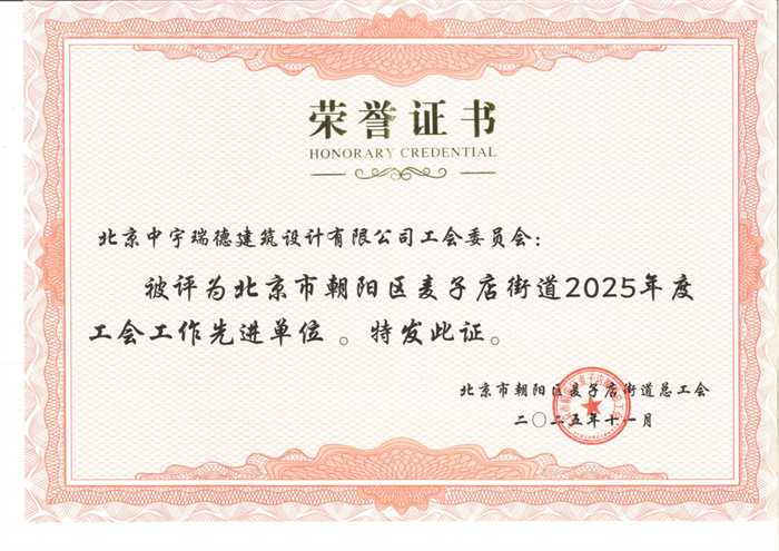 2025年,中宇瑞德建筑設計有限公司工會以“闖”的精神、“創”的勁頭、“干”的作風,在年末交出亮眼答卷。12月17日,麥子店街道總工會召開了“2025年度工會工作表彰大會”,會上進行了年度總結并對麥子店轄區內先進基層工會進行表彰。本次評選是從麥子店街道總工會轄區內603家基層工會中選取56家先進單位。中宇瑞德公司工會委員會連續第四年獲“年度工會工作先進單位”稱號,這既是來自上級工會的認可,也是公司全體員工的收獲。