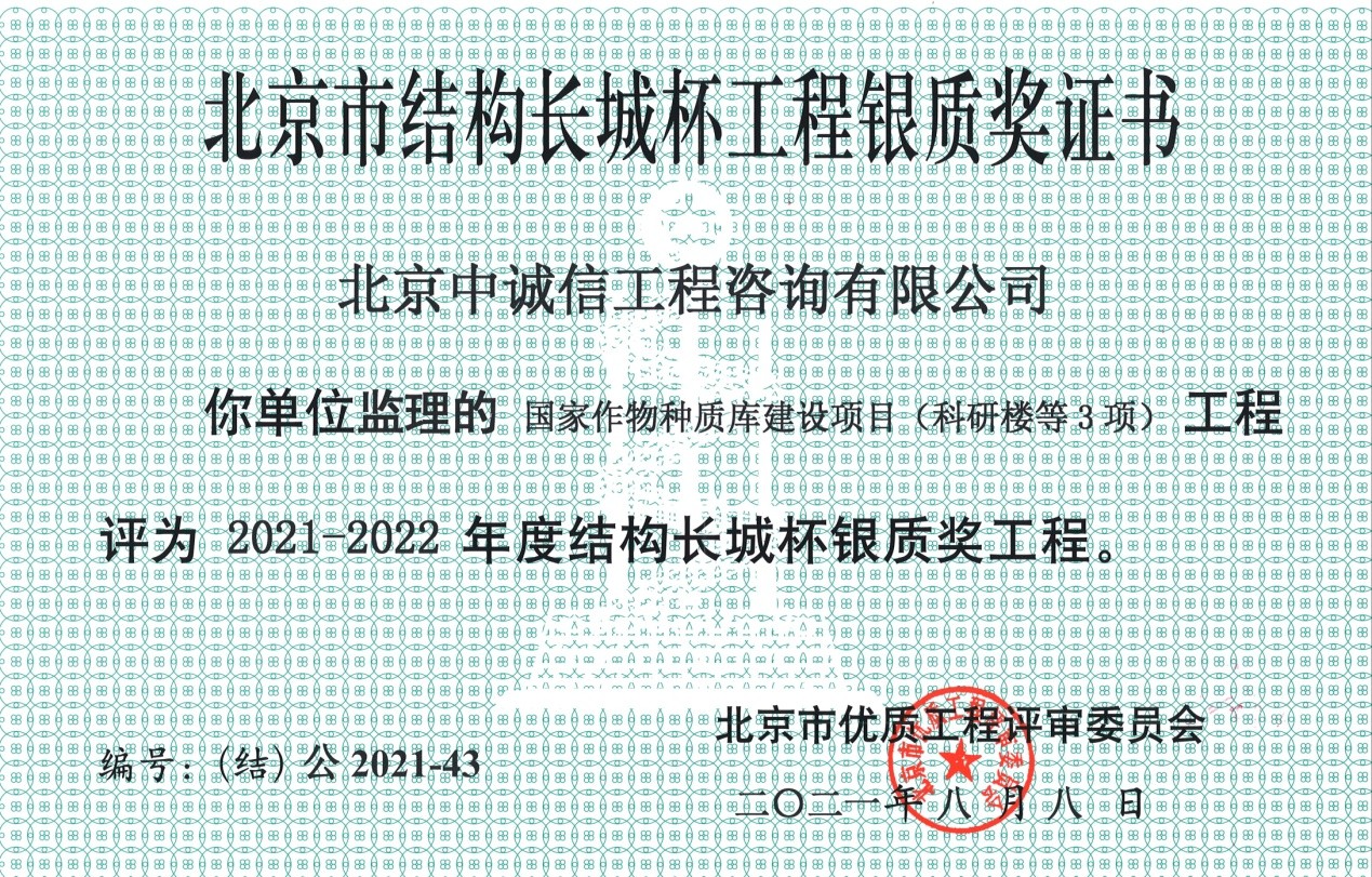 我院北京中誠信工程咨詢公司監理的國家作物種質庫建設項目(科研樓等3項)工程榮獲“北京市2021-2022年度結構長城杯銀質獎工程”榮譽稱號。