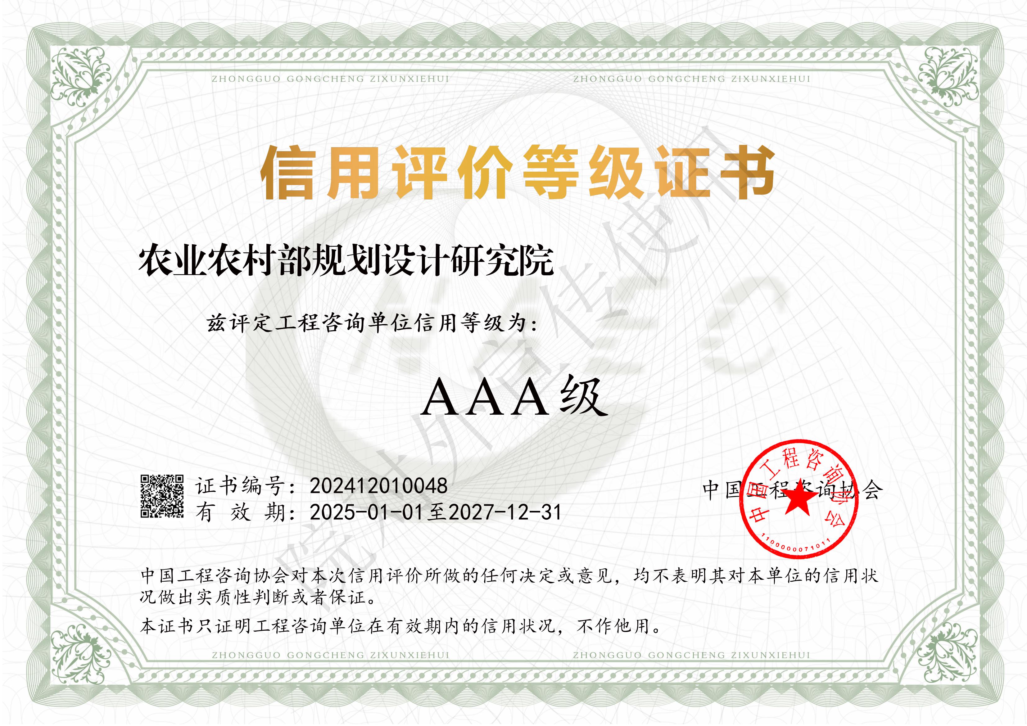 2025110日,中國工程咨詢協會發布公告,我院獲得工程咨詢單位信用評價AAA級。按照中國工程咨詢協會《工程咨詢單位信用評價管理辦法》,通過申報、評審、公示等程序,對單位誠信建設和信用管理五個方面23項指標進行綜合考核成功獲得工程咨詢單位信用評價AAA級,是對我院咨詢服務綜合能力的一次全面體檢,進一步提升了我院在行業中品牌影響力。