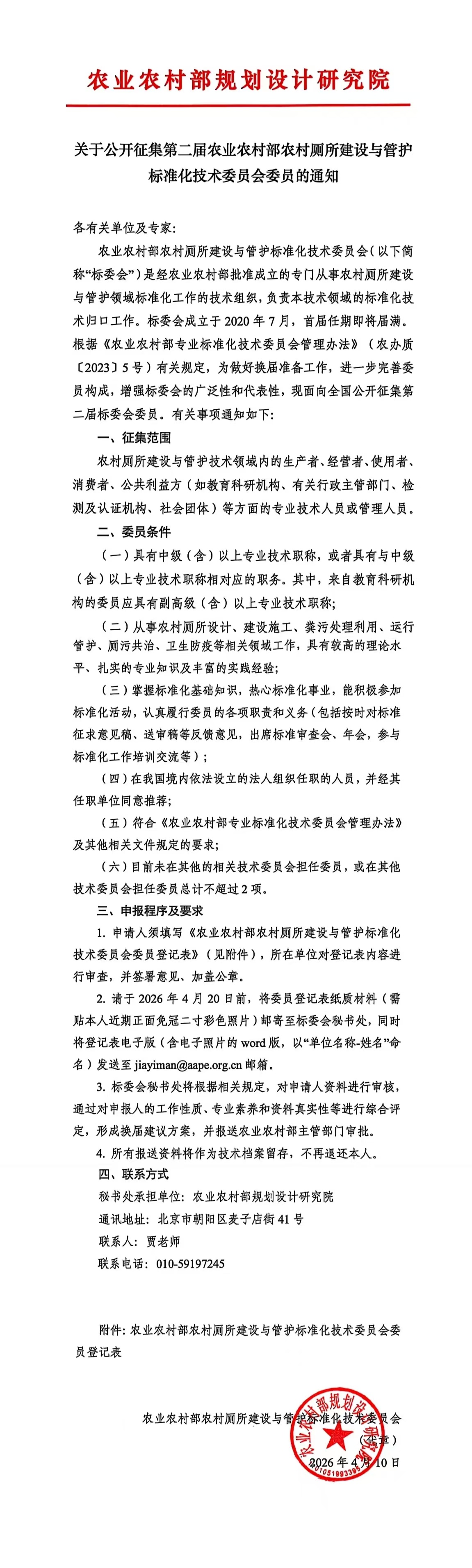關(guān)于公開(kāi)征集第二屆農(nóng)業(yè)農(nóng)村部農(nóng)村廁所建設(shè)與管護(hù)標(biāo)準(zhǔn)化技術(shù)委員會(huì)委員的通知